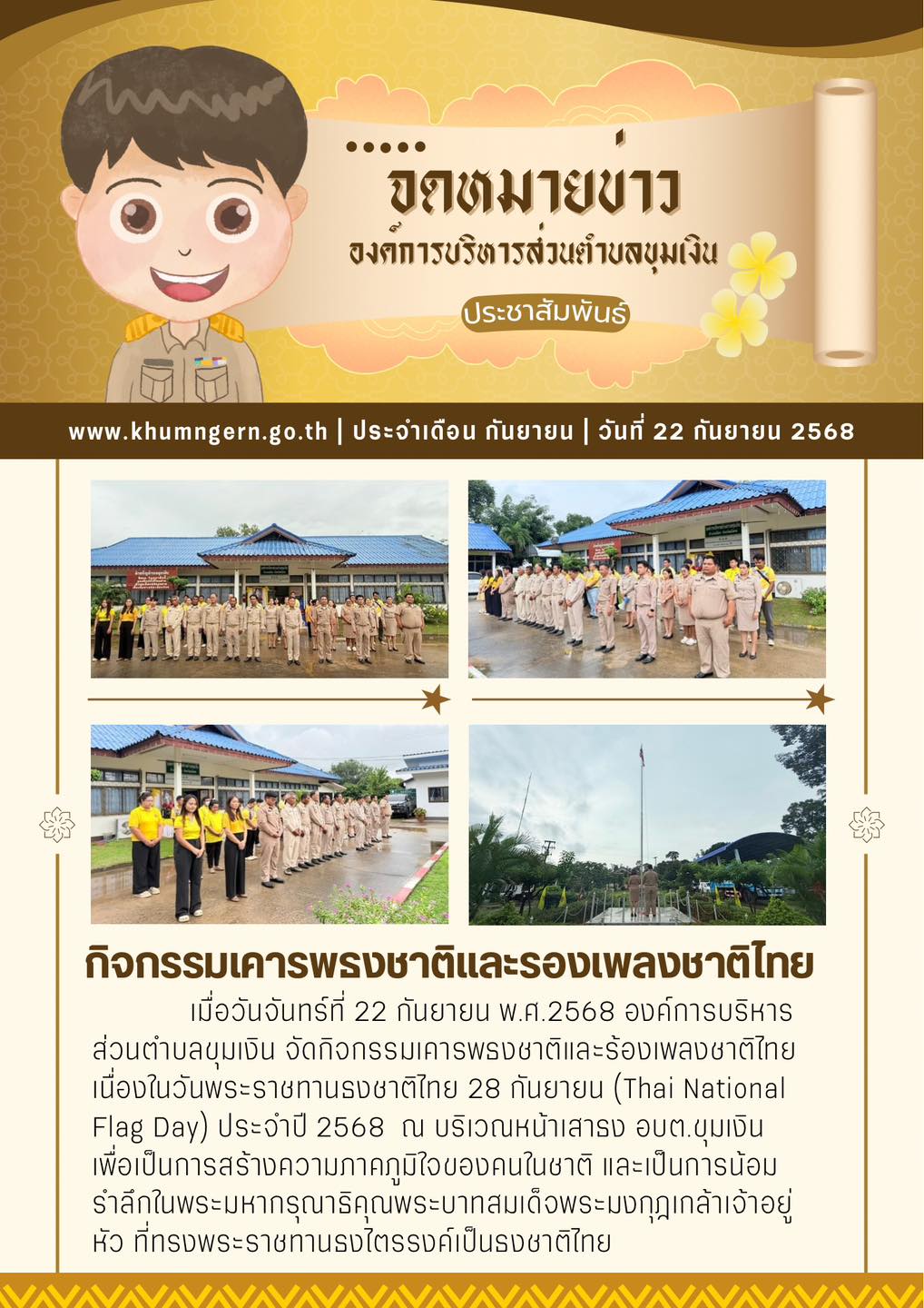 เมื่อวันจันทร์ที่ 22 กันยายน พ.ศ.2568 องค์การบริหารส่วนตำบลขุมเงิน จัดกิจกรรมเคารพธงชาติและร้องเพลงชาติไทย เนื่องในวันพระราชทานธงชาติไทย 28 กันยายน (Thai National Flag Day) ประจำปี 2568 ณ บริเวณหน้าเสาธง อบต.ขุมเงิน เพื่อเป็นการสร้างความภาคภูมิใจของคนในชาติ และเป็นการน้อมรำลึกในพระมหากรุณาธิคุณพระบาทสมเด็จพระมงกุฎเกล้าเจ้าอยู่หัว ที่ทรงพระราชทานธงไตรรงค์เป็นธงชาติไทย